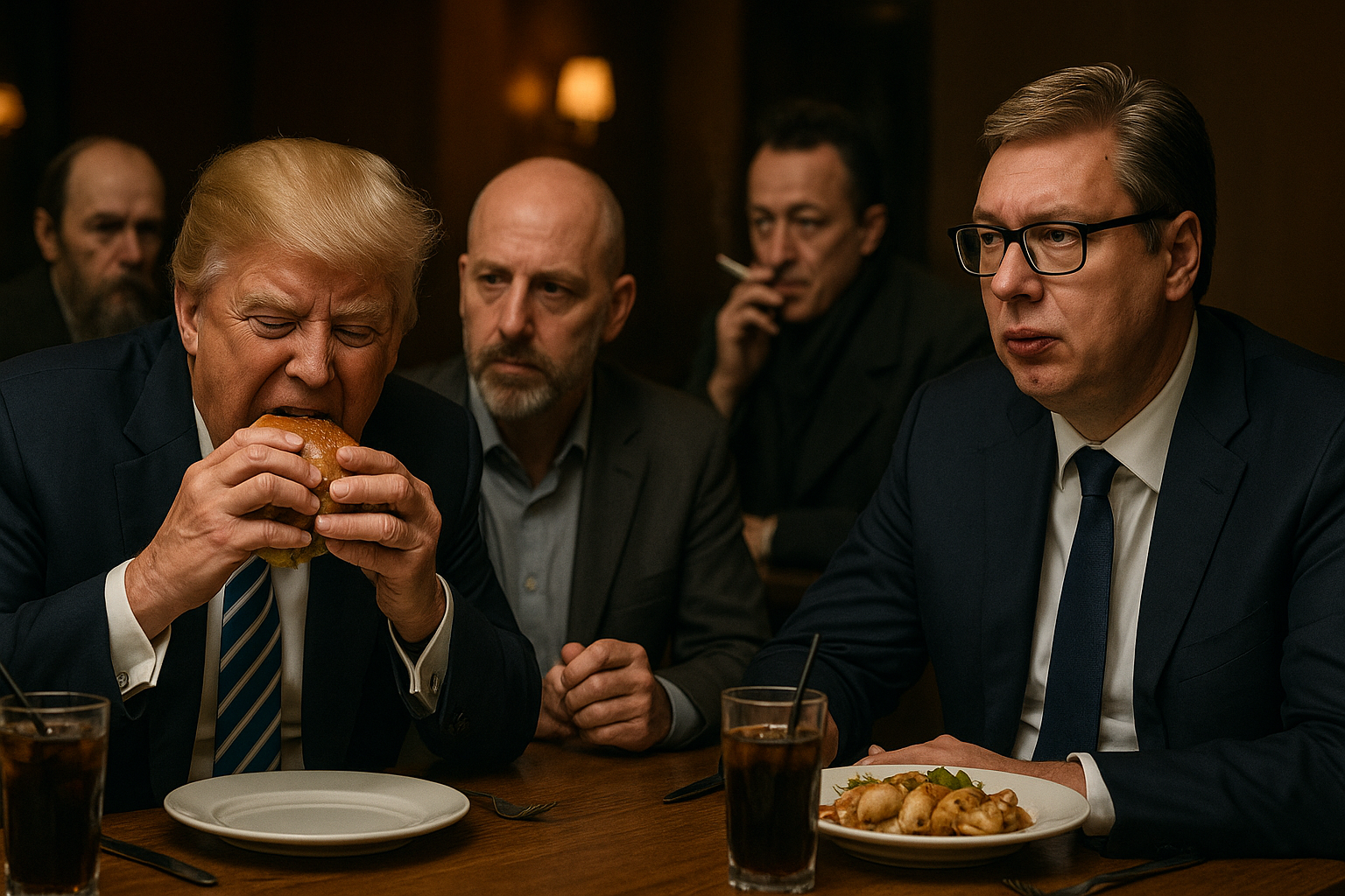 Tramp jede hamburger sa sirom i slaninom, a Vučić preko puta uzdiše nad tanjirom punjenih lignji koje mu stalno beže s viljuške, kao da ne žele da budu deo te priče.