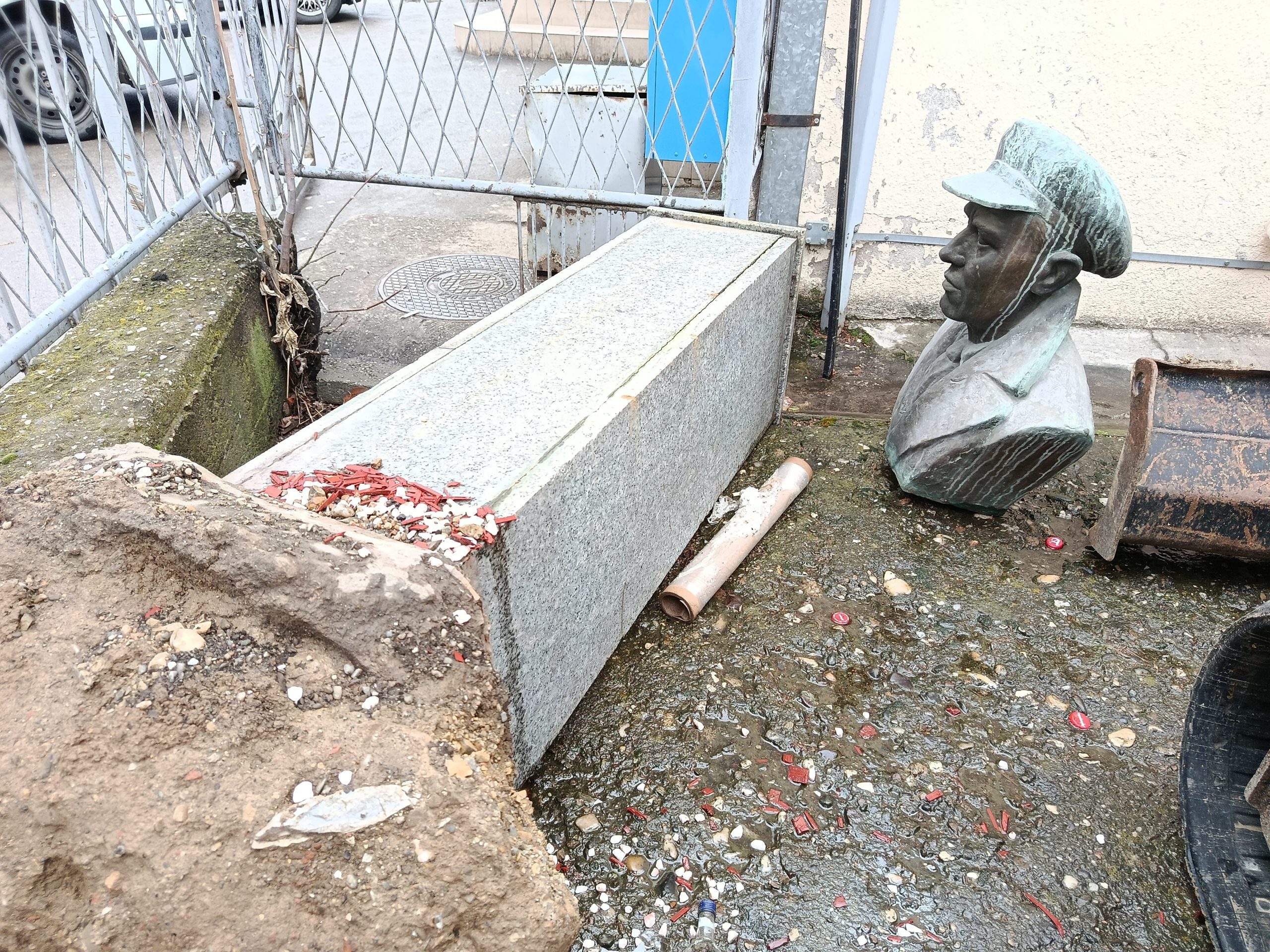 Naime, tada su nas građani obavestili da je već duže vreme bista nakrivljena na desnu stranu (gledajući sa ulice) i da nije bezbedno biti u njenoj blizini. Niko, međutim, nije našao za shodno da nešto učini i vrati je u prvobitni položaj ili da je bar ogradi da deca ili stariji prolaznici ne bi prilazili blizu nje.